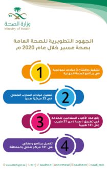 أوضحت صحة عسير أنه تم تفعيل عيادات الصحة المهنية بكامل التجهيزات في جميع المنشأت الصحية بالقطاع الحكومي والخاص،كما تم تشغيل وافتتاح 3 عيادات نموذجية في برنامج الصحة المهنية بكامل التجهيزات والمعايير المعتمدة وذلك خلال عام 2020 .