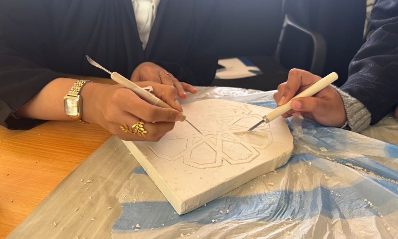 وشارك المعهد من خلال تنظيم ورشة تدريبية متخصصة في فن الجبس لطالبات الكلية التقنية، بإشراف الحرفية