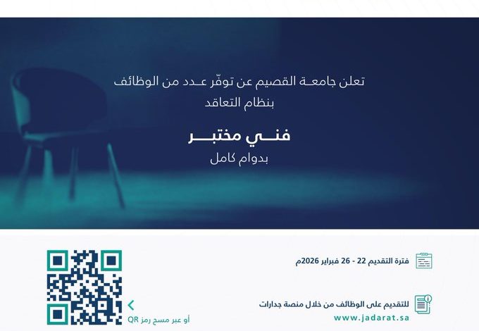 أعلنت جامعة القصيم عن توفر عدد من الوظائف الشاغرة بنظام التعاقد بدوام كامل بمسمى “فني مختبر”، عن طريق المسابقة الوظيفية، ابتداءً من يوم الأحد 22 فبراير 2026م، وحتى يوم الخميس 26 فبراير 2026م.