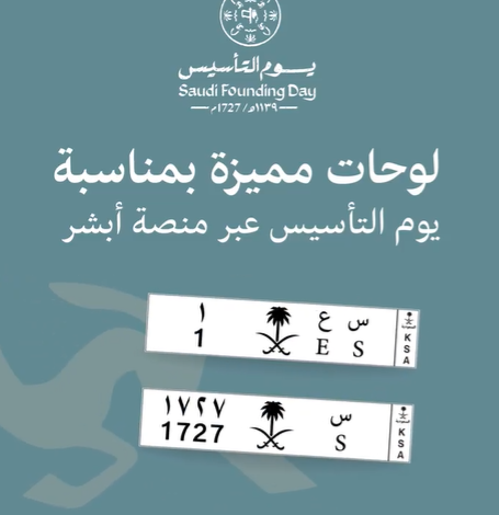 تزامنًا مع يوم التأسيس، أعلنت الإدارة العامة للمرور في الأمن العام عن طرح لوحات مميزة بحرف وحرفين عبر المنصة الإلكترونية لوزارة الداخلية “أبشر”، وتضمنت اللوحات المطروحة “س ع 1 خصوصي، س 1727 خصوصي، ر 10 خصوصي، س ع 1 نقل خاص”، وذلك ضمن خدمة مزاد اللوحات الإلكتروني المتاحة عبر منصة “أبشر”.