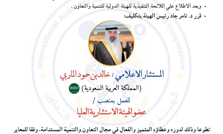 بعد الإطلاع على النظام الاساسي للهيئة الدولية للتنمية و التعاون التابعة للإتحاد الأوروبي المسجلة برقم(871251091 pic) تم تكليف المستشار الإعلامي السعودي خالد بن حمود الماربي عضواً للهيئة الإستشارية العليا نظراً لجهوده المتميزة في العمل التطوعي و التقارب بين الأديان و حضوره الإعلامي المميز.