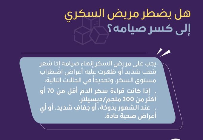 وأضافت الوزارة، عبر حسابها «عش بصحة» بمنصة (إكس)، أن مريض السكر يجب عليه إنهاء صيامه إذا شعر بتعب شديد أو ظهرت عليه أعراض اضطراب مستوى السكر.