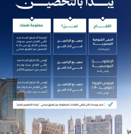 وأوضحت الوزارة أن لقاح الحمى الشوكية (النيسيرية) يُعد إلزاميًا لجميع الراغبين في أداء الحج والممارسين الصحيين، وذلك لمن لم يتلقَّ اللقاح خلال السنوات الخمس الماضية، حيث يمكن التحقق من حالة التحصين عبر تطبيق “صحتي”.