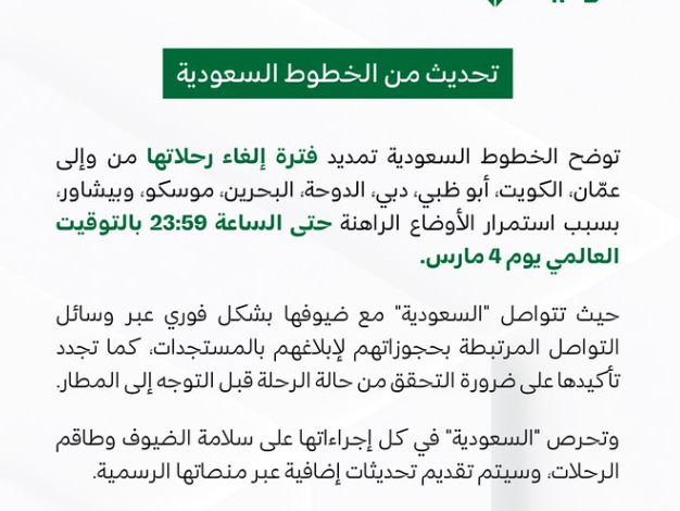 أعلنت مجموعة الخطوط السعودية تمديد فترة إلغاء رحلاتها من وإلى عمان، والكويت، وأبو ظبي، ودبي، والدوحة، والبحرين، وموسكو، وبيشاور، بسبب استمرار الأوضاع الراهنة حتى الساعة 23:59 بالتوقيت العالمي يوم 4 مارس.
