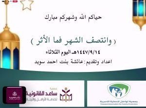 تشارك جمعية تواصل للحماية الأسرية بجازان بالتعاون مع جمعية ساعد القانونية في تنظيم سلسلة من الأمسيات الرمضانية التوعوية في إطار تعزيز الشراكة المجتمعية وترسيخ مفهوم المسؤولية الاجتماعية بما يسهم في تحقيق التكامل بين الحماية القانونية للمرأة وتعزيز الاستقرار الأسري.
