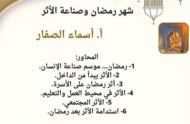 قدمت الأستاذة أسماء الصفار لقاءً توعوياً بعنوان “شهر رمضان وصناعة الأثر” عبر منصة زووم، يوم الاثنين الموافق 20 رمضان 1447هـ، 9 مارس 2026م، بحضور عدد من المهتمين، وذلك ضمن البرامج المعرفية التي تهدف إلى تعميق الوعي برسالة شهر رمضان وأثره في حياة الأفراد والمجتمعات.