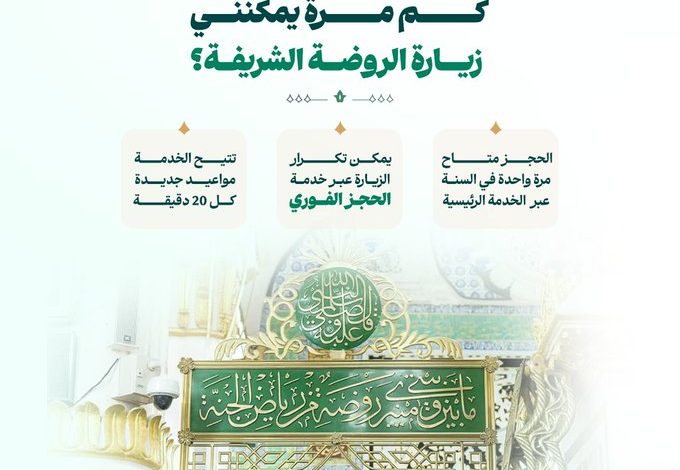 وبيّنت الوزارة عبر مركز توعية ضيوف الرحمن، ضمن رسائلها التوجيهية للقادمين لأداء المناسك تحت شعار “جاي للعمرة؟”، أن الحجز الأساسي لزيارة الروضة الشريفة يُتاح للمستفيد مرة واحدة في السنة عبر الخدمة الرئيسية، وذلك بهدف إتاحة الفرصة والتوزيع العادل بين جميع الزوار والمصلين.