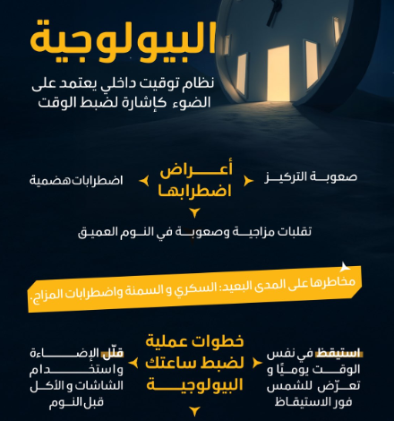 وبيّنت أن الساعة البيولوجية هي نظام توقيت داخلي يعتمد على الضوء الخارجي كإشارة رئيسية لضبط وقت الاستيقاظ والنوم.