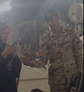 وفي التفاصيل لاحظ الجندي أول محمد أحمد الشريف طفلا فقد مرافقيه وسط الزحام وقد بدت عليه علامات الخوف والقلق فما كان منه إلا أن سارع إليه وحمله بين ذراعيه محاولا تهدئته بكلمات لطيفة ولمسات أبوية حانية وظل يربت على كتفيه برفق ويحتضنه بعناية حتى هدأ الطفل تدريجيا وتوقف عن البكاء في مشهد حاز إعجاب كل من شاهده.