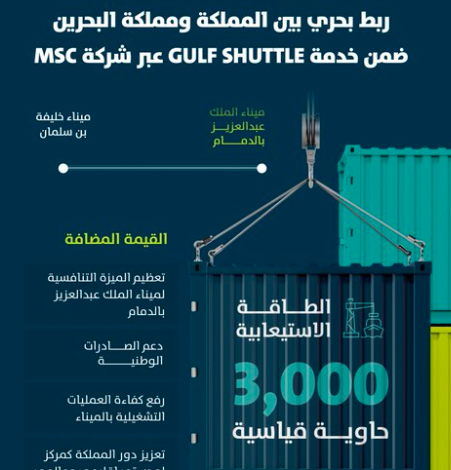 وتعمل خدمة GULF SHUTTLE على ربط ميناء الملك عبدالعزيز بالدمام بميناء خليفة بن سلمان بمملكة البحرين، بطاقة استيعابية تصل إلى 3,000 حاوية قياسية.