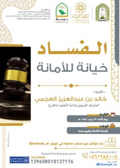 نظم فرع وزارة الشؤون الإسلامية والدعوة والإرشاد بالمنطقة الشرقية، اليوم، محاضرة بعنوان: (الفساد خيانة للأمانة) ألقاها الشيخ خالد بن عبدالعزيز العجمي “عن بعد”، عبر حساب جمعية الدعوة والإرشاد وتوعية الجاليات بمحافظة الخبر “هداية” على تويتر الساعة الثامنة والربع مساء.