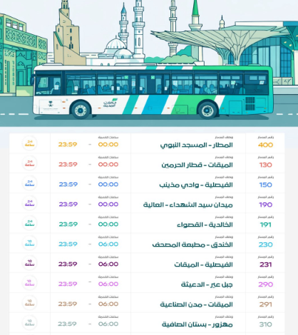 “حافلات المدينة” تعلن مواعيد تشغيل حافلات النقل العام بالمدينة المنورة