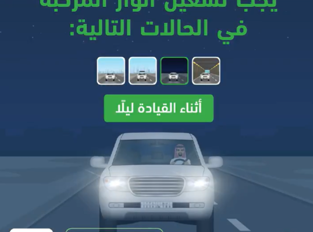 دعا المرور السعودي قائدي المركبات إلى ضرورة تشغيل مصابيح السيارة في الأوقات المناسبة، لما لذلك من دور مهم في الحفاظ على سلامتهم وسلامة الآخرين على الطرق.