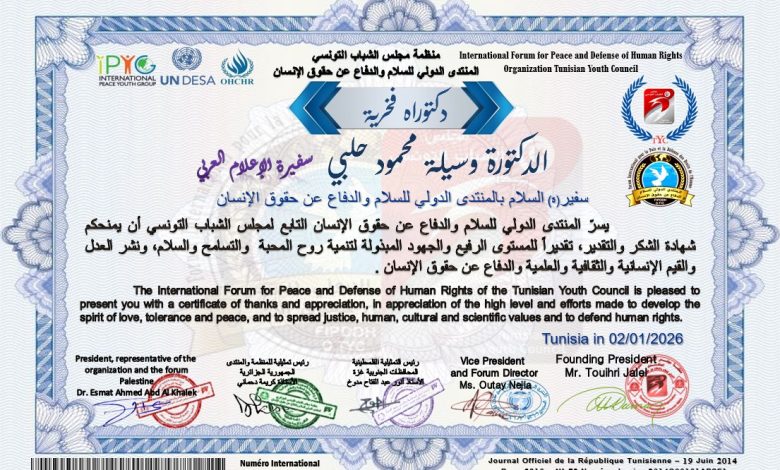 من جانبها، عبّرت الدكتورة وسيلة الحلبي عن بالغ شكرها وتقديرها للقائمين على منظمة مجلس الشباب التونسي والمنتدى الدولي للسلام والدفاع عن حقوق الإنسان، مثمنةً هذا التكريم الذي يمثل حافزًا لمواصلة مسيرتها في نشر الخير والسلام وخدمة الإنسان.