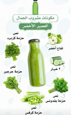مكونات مشروب الجمال هي: نحضر التفاح الأخضر وعدد اثنين خياره ونص حزمه كزبره ونصف حزمه جرجير ونص حزمه بقدونس ونص حزمه كرفسر،رنضيف هذه الخضروات معار ، ليصبح ميكس عصير مغذي جدا للصحة وتناوله يوميا مرة إلى مرتين في اليوم صباحا ومساء