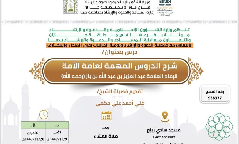 نفّذت وزارة الشؤون الإسلامية والدعوة والإرشاد، ممثّلةً بفرعها في منطقة جازان – إدارة المساجد بمحافظة صبيا – برنامجين دعويين وتوعويين استهدفا طلاب وطالبات المحافظة، وذلك ضمن جهودها في ترسيخ القيم الإسلامية وتعزيز العناية ببيوت الله.