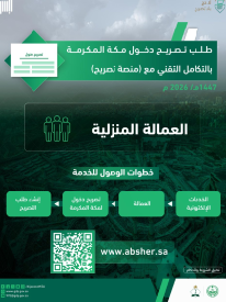 وأوضحت الجوازات، عبر منصة إكس، أنه يمكن طلب تصريح دخول مكة المكرمة بالتكامل التقني مع منصة تصريح) لعام 1447هـ / 2026 م، للعمالة المنزلية، من خلال الدخول أولا إلى منصة أبشر ثم اختيار الخدمات الإلكترونية.