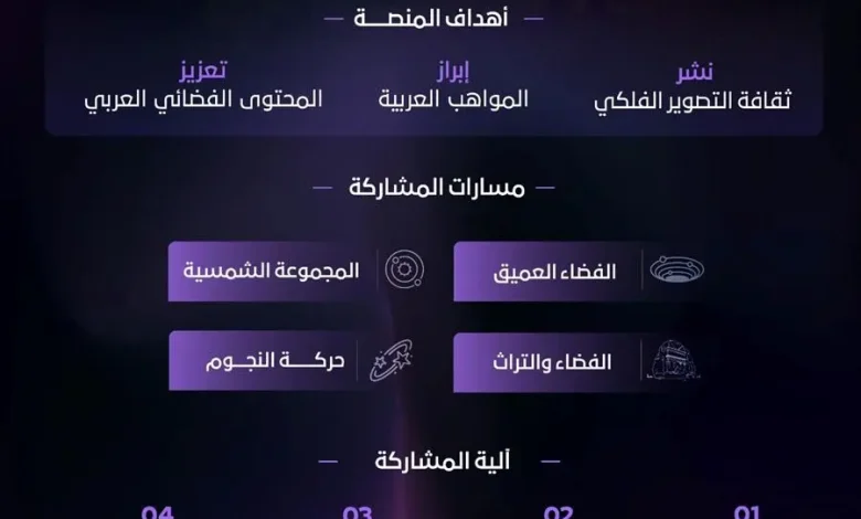 وتركّز المنصة على إبراز المواهب العربية في التصوير الفلكي، من خلال إتاحة مسارات متعددة للمشاركة تشمل: الفضاء العميق، والمجموعة الشمسية، وحركة النجوم، والفضاء والتراث، بما يسهم في إبراز الأعمال الإبداعية للمصورين على المستوى العربي وتعزيز حضورهم في هذا المجال.