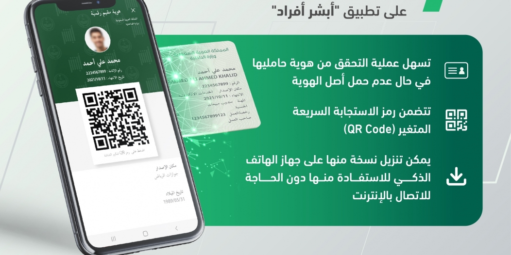 هي خدمة رقمية أطلقتها المديرية العامة للجوازات تحت إشراف وزارة الداخلية خدمة هوية مقيم الرقمية في تطبيق “أبشر أفراد”، حيث وفرت عبرهُ نسخة رقمية من “هوية مقيم” وقابلة لاستعراضها في أي وقت وبدون الحاجة للاتصال بالإنترنت بعد تحميلها في أول مرة. كما ستكون كافية لاستخدامها في إجراءات الإثبات لدى أي جهة أمنية في حال عدم حمل الأصل المطبوع من الهوية
