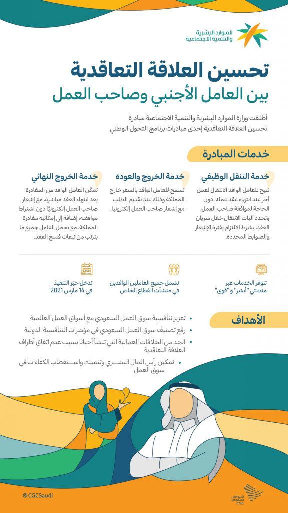 وتتضمن المبادرة ثلاث خدمات : خدمة التنقل الوظيفي، وتطوير آليات الخروج والعودة، والخروج النهائي. وتشمل خدمات المبادرة جميع العاملين الوافدين في منشآت القطاع الخاص ضمن ضوابط محددة.