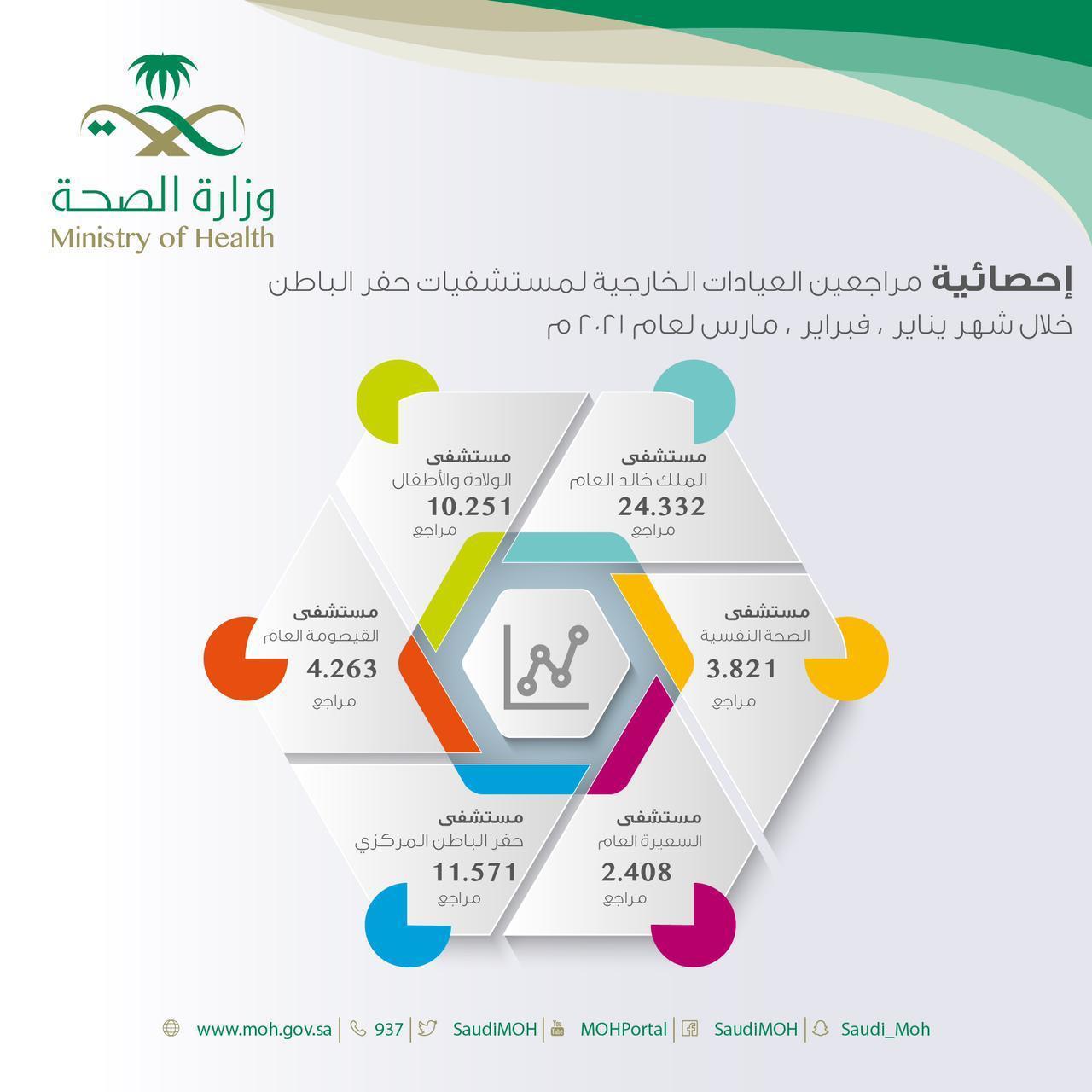 قدمت صحة حفر الباطن ممثلة بمستشفياتها خدماتها العلاجية والتشخيصية لـ 56,646 مراجعاً للعيادات الخارجية خلال الثلاثة أشهر الماضية لعام 2021 إذا بلغ عدد مراجعي العيادات الخارجية بمستشفى الملك خالد العام 24,332 مراجعاً ، فيما بلغ عدد مراجعي العيادات الخارجية بمستشفى الولادة والأطفال 10,251 مراجعاً ، ليصل عدد مراجعي العيادات الخارجية بمستشفى حفر الباطن المركزي 11,571 مراجعاً ، فيما تخطى عدد مراجعي العيادات الخارجية بمستشفى القيصومة العام 4,263 مراجعاً ، كما بلغ عدد مراجعي العيادات الخارجية بمستشفى الصحة النفسية 3,821 مراجع ، ووصل عدد مراجعي العيادات الخارجية بمستشفى السعيرة العام 2,408 مراجع.