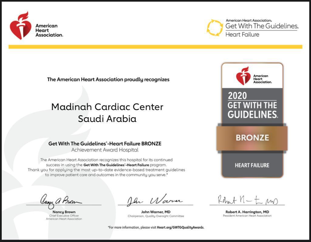 منحت جمعية القلب الأمريكية شهادة التميز والاعتماد لمركز أمراض وجراحة القلب بالمدينة المنورة عضو تجمع المدينة المنورة الصحي في معالجة مرضى قصور القلب وفق أعلى المعايير العالمية ، كأول مركز متخصص في أمراض القلب يتم اعتماده على مستوى الشرق الأوسط .