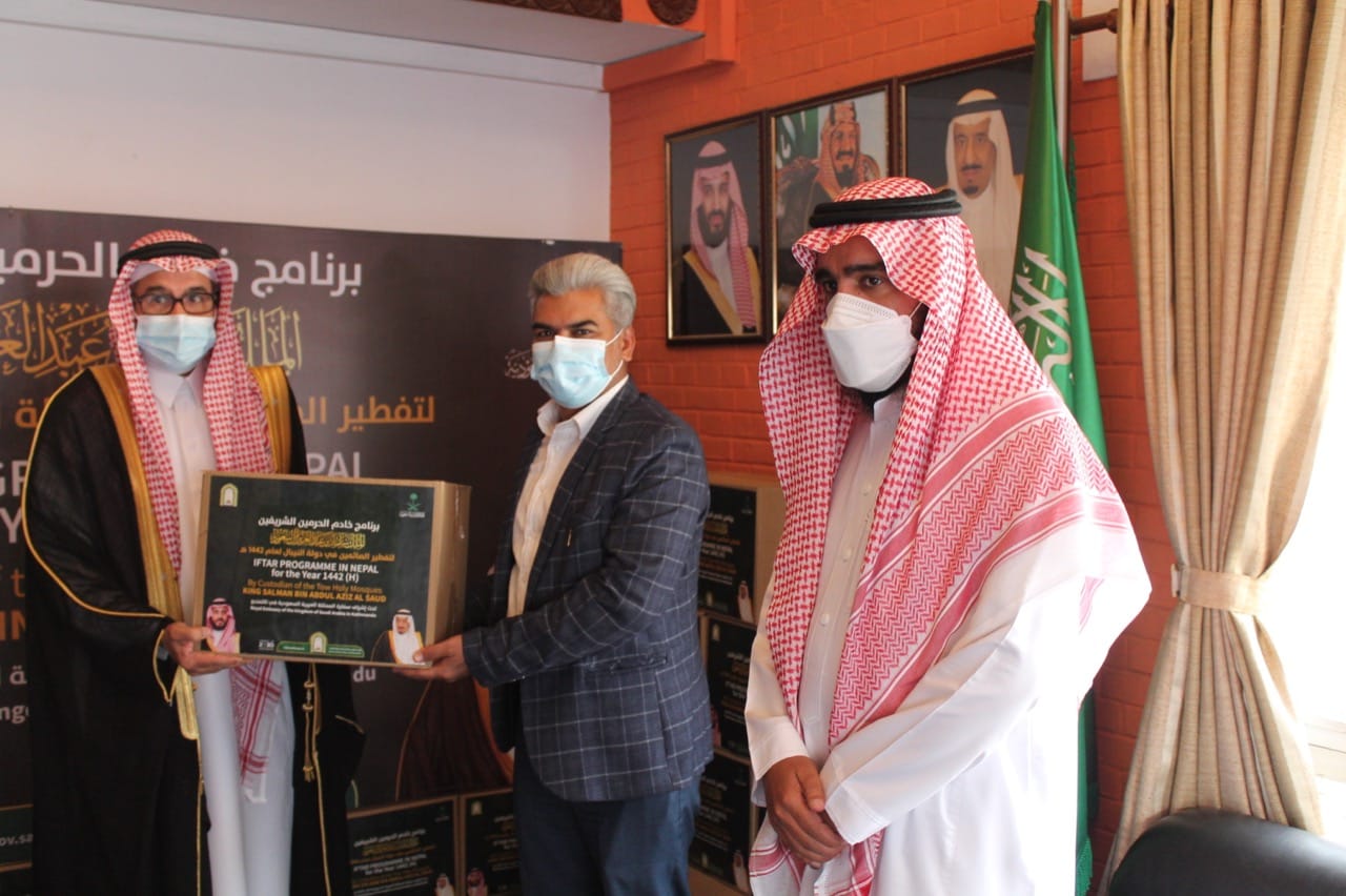 دشنت وزارة الشؤون الإسلامية والدعوة والإرشاد ممثلة بالملحقية الدينية في سفارة المملكة في الهند، برنامج هدية خادم الحرمين الشريفين الملك سلمان بن عبدالعزيز آل سعود ـ حفظه الله ـ لتفطير الصائمين ، بمقر سفارة المملكة بكاتمندو عاصمة نيبال، بمناسبة حلول شهر رمضان المبارك لعام 1442هــ وفق البروتوكولات الصحية المعتمدة للوقاية من فيروس كورونا.