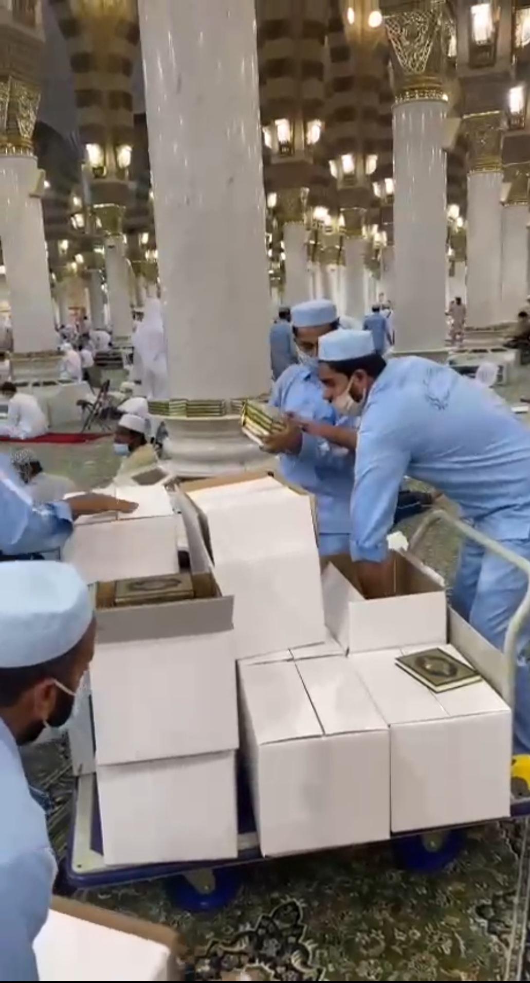 تداول رواد مواقع التواصل الاجتماعي مقطع فيديو يوثق عودة المصاحف إلي أماكنها من جديد فى المسجد النبوي الشريف ولله الحمد ، بعد رفعها لمدة استمرت عدة شهور ، كإجراء احترازى للتعامل مع فيروس كورونا