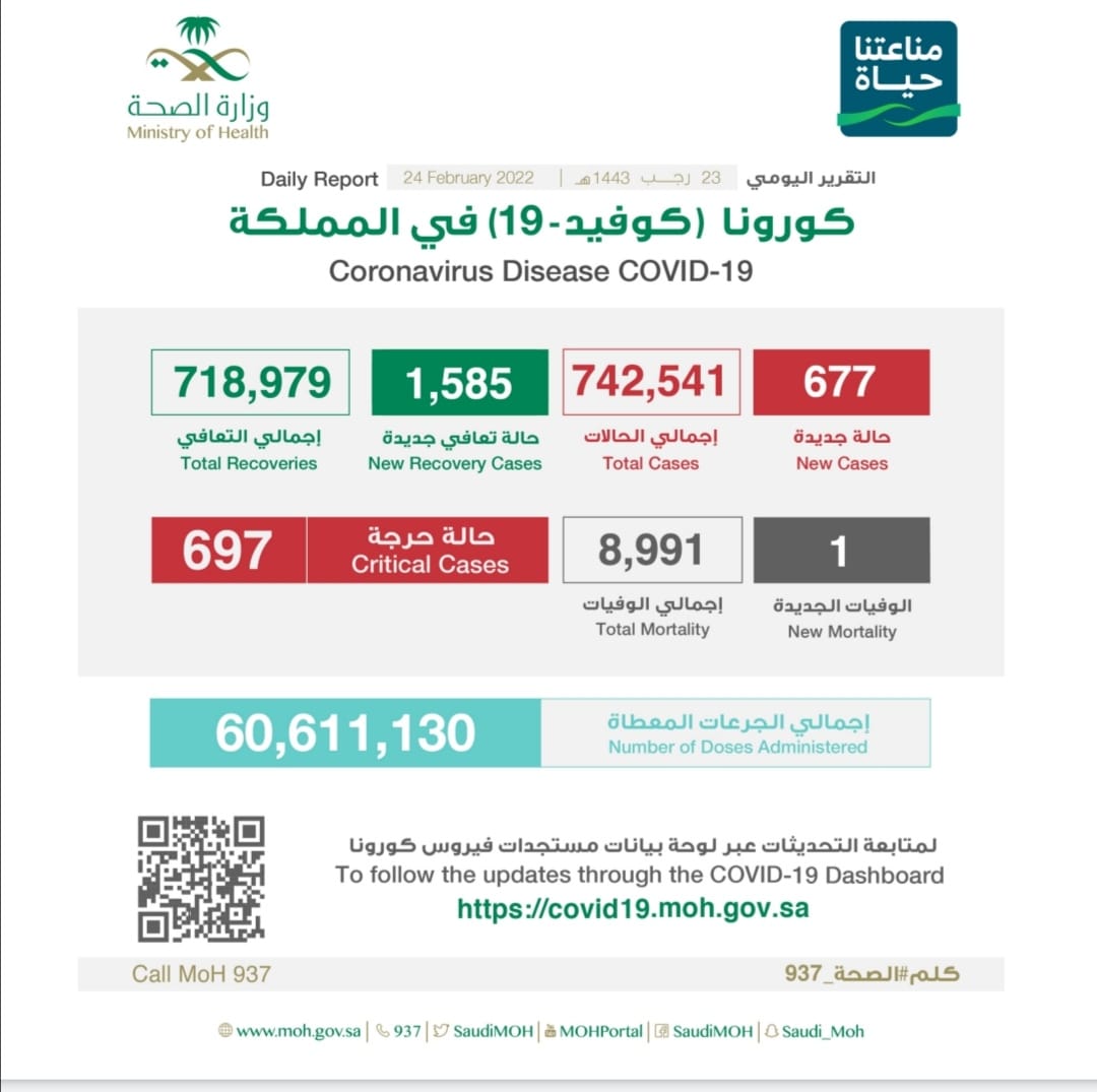 أعلنت الصحة إحصائية جديدة لمستجدات كورونا في المملكة خلال الـ 24 ساعة الماضية تضمنت تسجيل (677) حالة مؤكدة وتعافي (1585) حالة فيما بلغ عدد الحالات الحرجة (697) حالة،