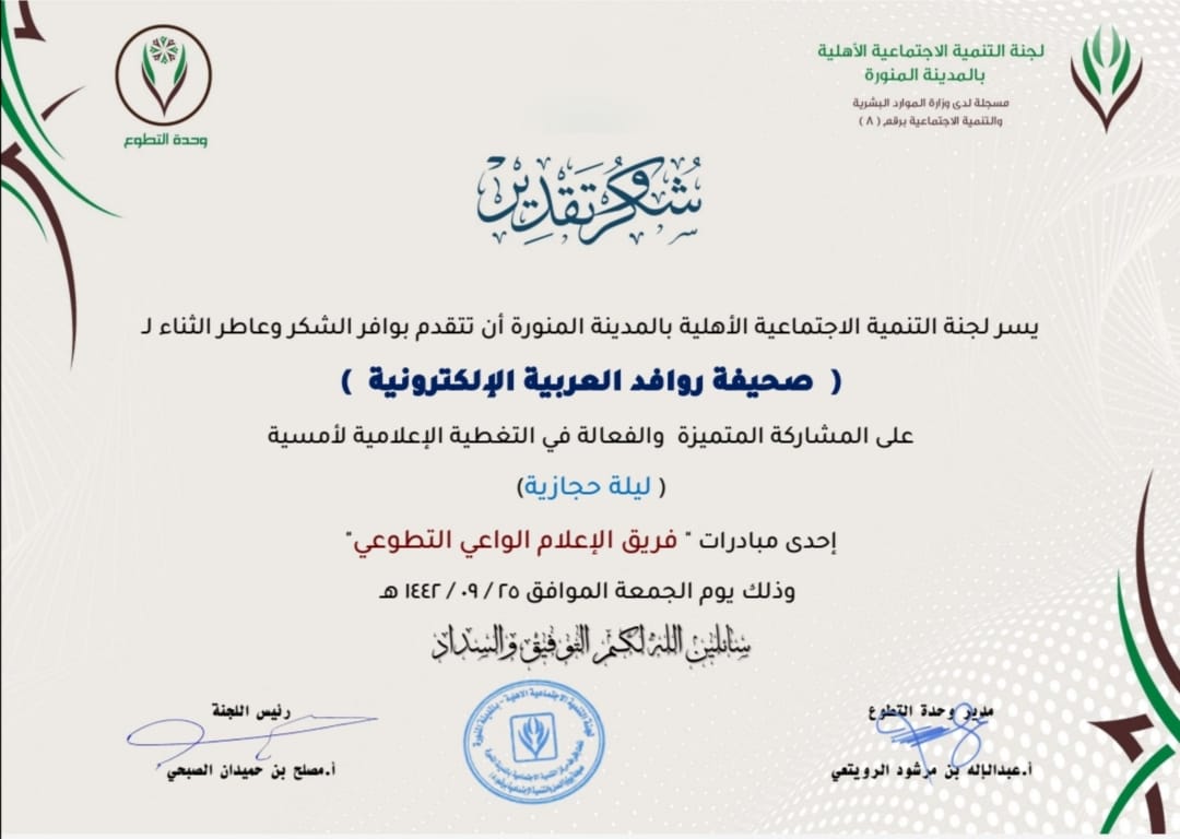 تم تكريم صحيفة روافد العربية الإلكترونية مساء اليوم الثلاثاء من قبل لجنة التنمية الاجتماعية الأهلية بالمدينة المنورة بشهادة (شكر وتقدير) بمناسبة التغطية الإعلامية لأمسية ( ليلة حجازية) إحدى مبادرات فريق الإعلام الواعي التطوعي التي قدمتها الإعلامية – خديجة السيد عبر برنامج زوم .