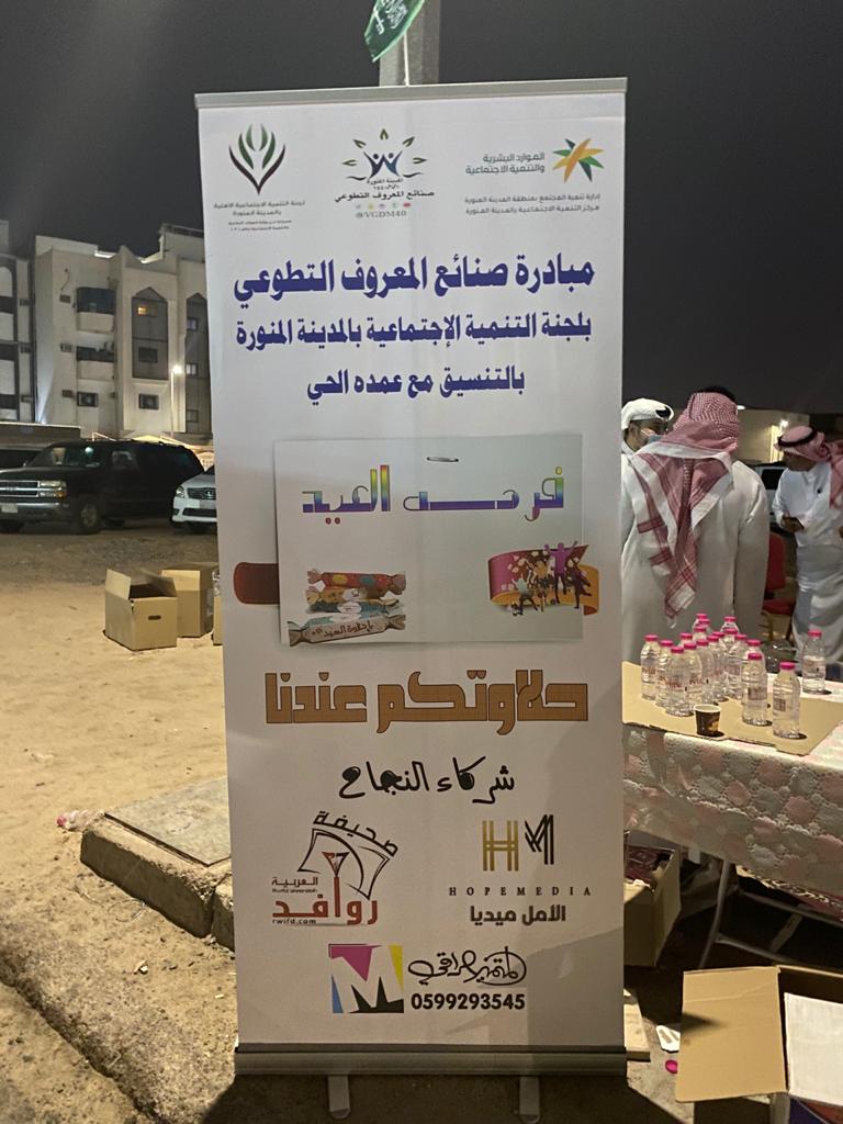 في بادرة إنسانية مجتمعية خيرية بمناسبة قرب العيد السعيد نظم فريق صنائع المعروف مبادرة بعنوان ( فرحة العيد ) بتوزيع صحون الحلوة لسكان حي الأعمدة بالمدينة المنورة ودشن المبادرة الأستاذ- ناصر القاضي مدير إدارة تنمية المجتمع بالمدينة وبحضور الأستاذ – مصلح الصبحي مدير لجنة التنمية الاجتماعية الأهلية والأستاذ – عبدالاله الرويتعي مدير وحدة التطوع بالجمعية.والدكتور فهد الأحمدي قائد الفريق.
