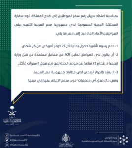 سفارة المملكة بالقاهرة توجه تنبيهًا هامًا للمواطنين القادمين إلى مصر