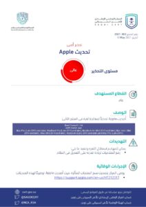 أصدر المركز الوطني الإرشادي للأمن السيبراني ، اليوم الثلاثاء، تحذير عالي الخطورة بشأن تحديث apple