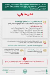 بناء على ما رفعته الجهات المختصة بشأن الإجراءات التي اتخذتها المملكة في مواجهة فيروس كورونا المستجد (كوفيد 19), ولغرض الحفاظ على الصحة العامة.تقرر ما يلي»: