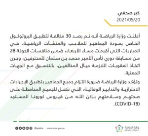 وتؤكد وزارة الرياضة ضرورة التزام جميع الجماهير بتطبيق الإجراءات الاحترازية والتدابير الوقائية، التي تكفل للجميع المحافظة على صحتهم وسلامتهم بإذن الله من فيروس كورونا المستجد COVID-19)).