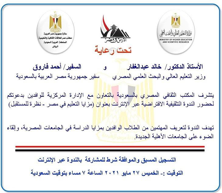 تحت رعاية الأستاذ الدكتور/ خالد عبدالغفار وزير التعليم العالي والبحث العلمي المصري و السفير/ أحمد فاروق سفير جمهورية مصر العربية بالسعودية ، يقيم المكتب الثقافي المصري بالسعودية بالتعاون مع الإدارة المركزية للوافدين ندوة تثقيفية افتراضية عبر الإنترنت بعنوان (مزايا التعليم في مصر – نظرة للمستقبل).