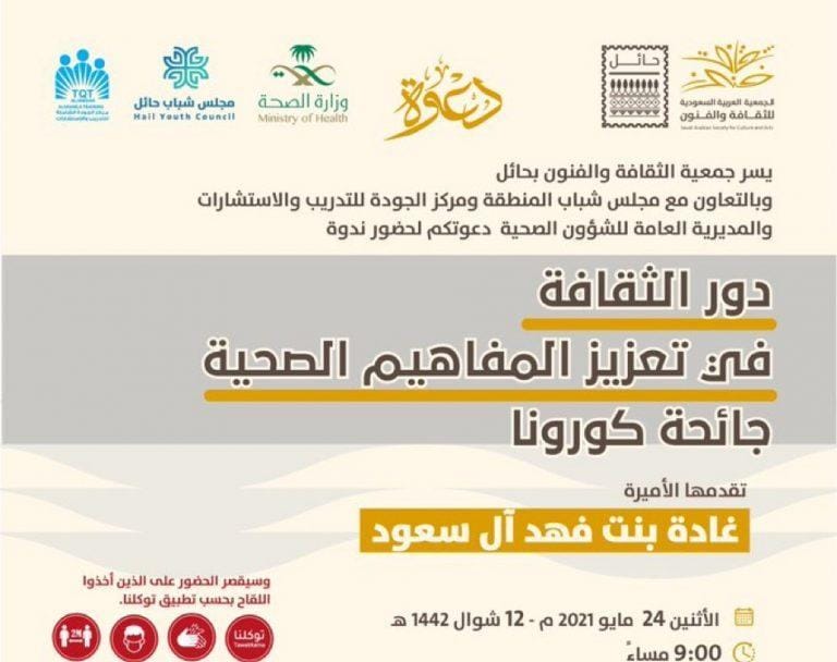 تحل اليوم الاثنين الموافق ٢٤مايو صاحبة السمو الأميرة غادة بنت فهد آل سعود ضيفة على جمعية الثقافة والفنون بحائل وذلك لتقديم ندوة (دور الثقافة في تعزيز المفاهيم الصحية ،كورونا نموذجًا) والذي تنظمه الجمعية بالتعاون مع مجلس شباب منطقة حائل والمديرية العامة للشؤون الصحية بالمنطقة ٠