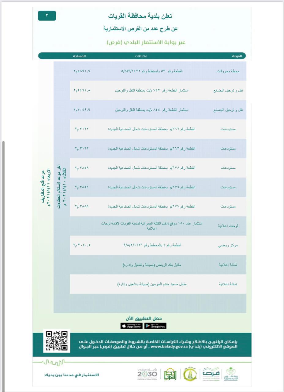 أعلنت بلدية محافظة القريات عن طرح عدد كبير من الفرص الاستثمارية المتنوعة التي تدعم احتياجات المجتمع ومتطلباته وإثراء الخارطة الاستثمارية في المحافظة ، عبر منصة فرص الاستثمارية في الموقع الإلكتروني وذلك بتوجيه ومتابعة رئيس البلدية المهندس فهد بن ابراهيم العنزي .