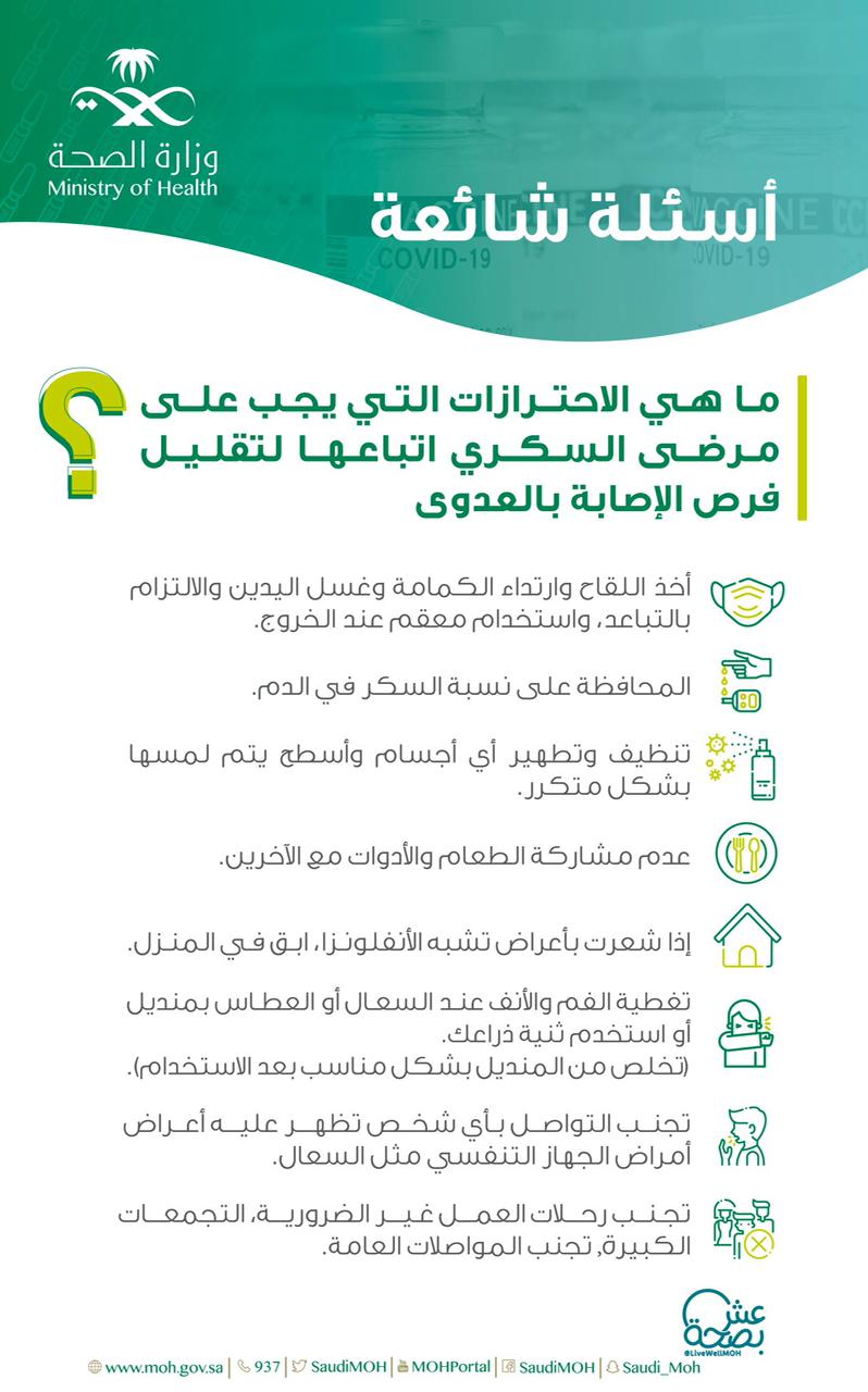 قالت وزارة الصحة في معرض ردها على الاحترازات التي يجب على مرضى السكري اتباعها لتقليل فرص الإصابة بالعدوى بفيروس كورونا أنه يجب اتباع التعليمات الأتية :