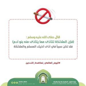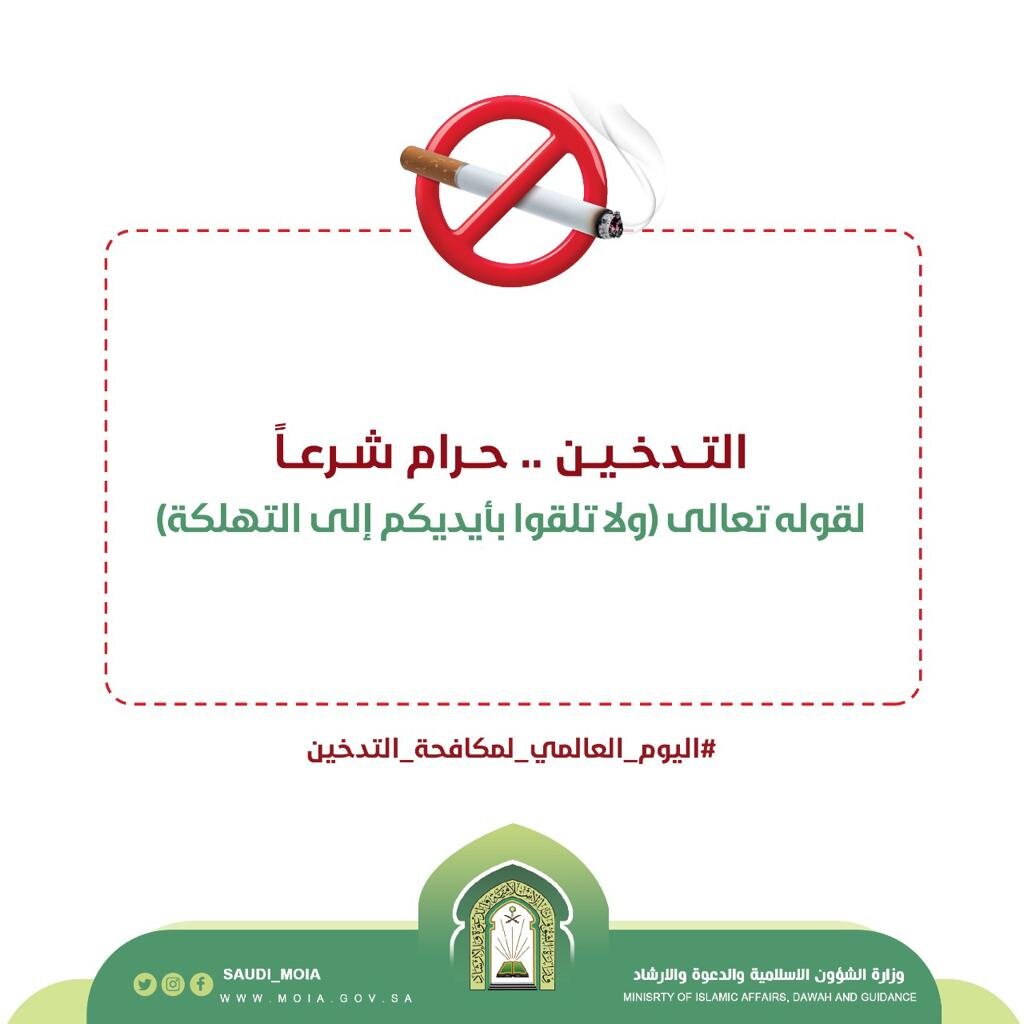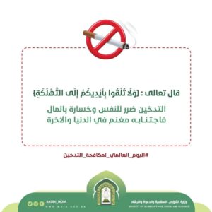 شاركت وزارة الشؤون الإسلامية والدعوة والإرشاد بفعاليات اليوم العالمي لمكافحة التبغ الذي يوافق يوم 31 من مايو من كل عام.. حيث وجه معالي الوزير الشيخ الدكتور عبداللطيف بن عبدالعزيز آل الشيخ، أصحاب الفضيلة خطباء الجوامع بتضمين خطبهم بيان أضرار التبغ، وبيان النصوص الشرعية التي وردت في الكتاب والسنة المؤكدة على حفظ النفس البشرية وصيانتها مما يؤدي لتلفها.