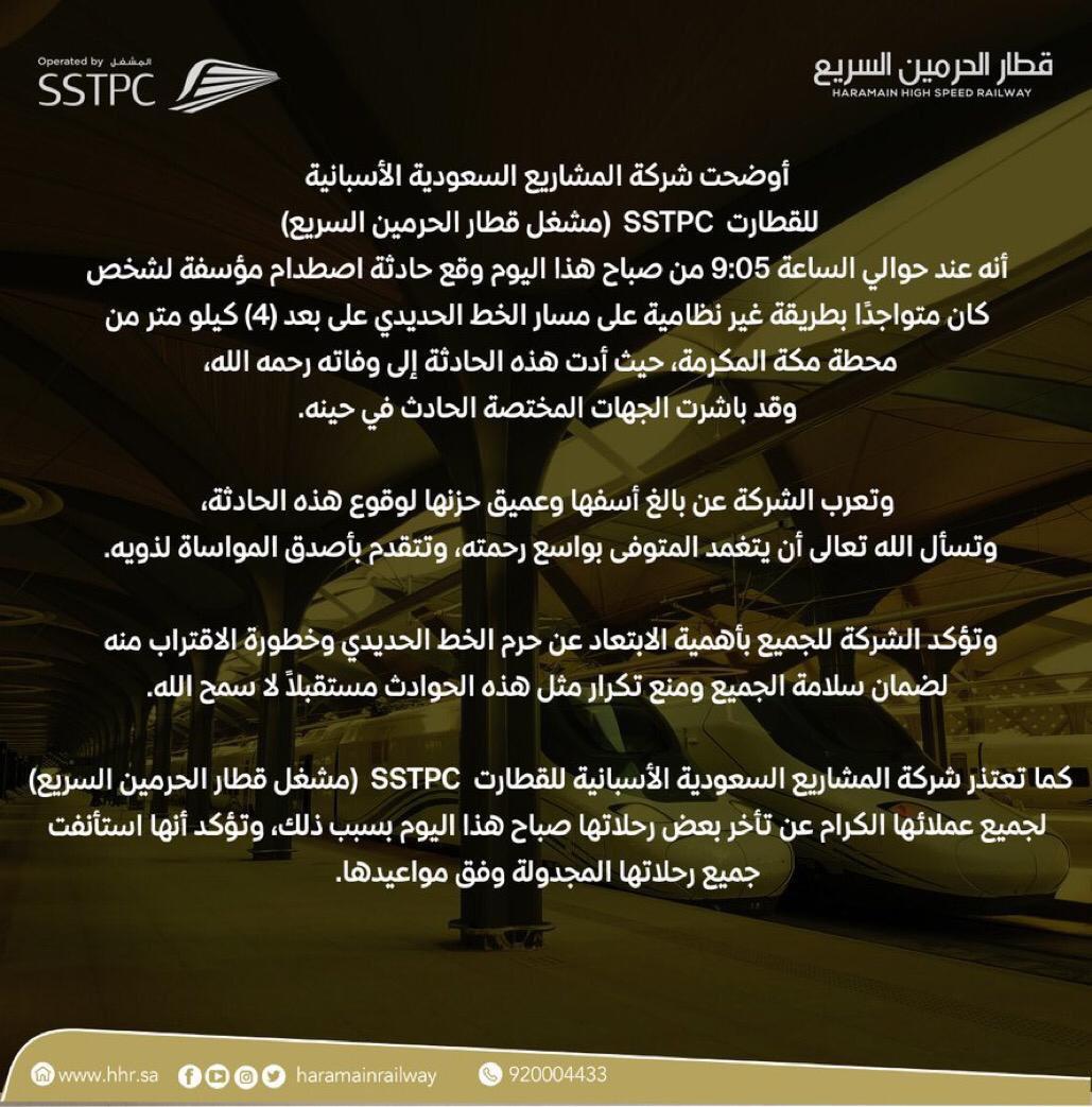أوضحت شركة المشاريع السعودية الأسبانية اللقطارت SSTPC (مشغل قطار الحرمين السريع) أنه عند حوالي الساعة 9:05 من صباح هذا اليوم وقع حادثة اصطدام مؤسفة لشخص ، كان متواجدا بطريقة غير نظامية على مسار الخط الحديدي على بعد (4) كيلو متر من محطة مكة المكرمة، حيث أدت هذه الحادثة إلى وفاته رحمه الله ، وقد باشرت الجهات المختصة الحادث في حينه.