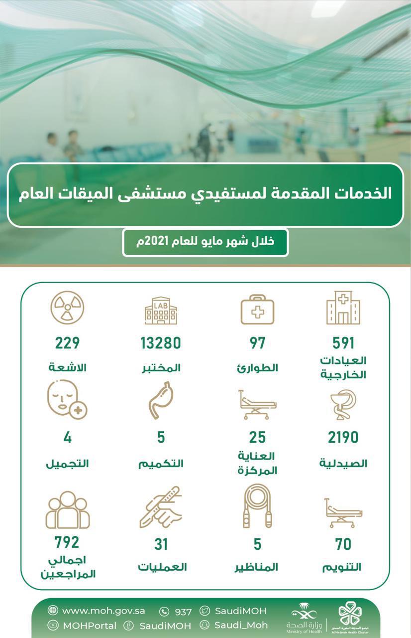 قدّم مستشفى الميقات العام بالمدينة المنورة خدماته عبر العيادات الخارجية لـعدد 591 مستفيدا ،فيما استقبل قسم الطوارئ 97 مراجعا، وذلك خلال شهر مايو من العام 2021 م .
