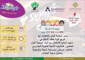 أقامت جمعية “كيان” للأيتام ذوي الظروف الخاصة لأبنائها الأيتام فعاليتها الثانية بعنوان ” العودة للمدارس بعد جائحة كورونا” وذلك بالتعاون مع فريق قوة عطاء التطوعي بقيادة الأستاذ عبد العزيز السمح، وباستضافة شركة أساطير الترفيهية .وحضر الفعالية ما يقارب “60 طالب وطالبة” من أبناء جمعية كيان ، حيث تم استقبالهم وتقديم فقرات توعوية لهم على المسرح عن العودة للمدارس والتهيئة النفسية لهم بعد انقطاعهم بسبب جائحة كورونا .