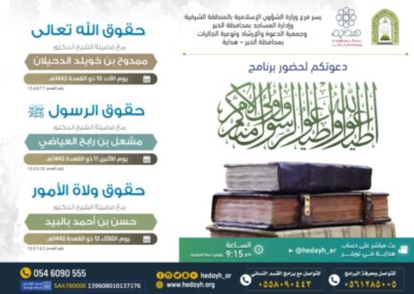 تنظم وزارة الشؤون الإسلامية والدعوة والإرشاد في المنطقة الشرقية، بالتعاون مع جمعية الدعوة والإرشاد وتوعية الجاليات بالخبر “هداية”، عدداً من المحاضرات الدعوية ضمن برنامج (أَطِيعُوا اللَّهَ وَأَطِيعُوا الرَّسُولَ وَأُولِي الأَمْرِ مِنْكُم) يلقيها دعاة الفرع “عن بُعد” عبر البث المباشر على حساب الجمعية في تويتر الساعة التاسعة والربع.. حيث يبدأ اليوم العاشر وحتى الثاني عشر من شهر ذو القعدة الجاري.