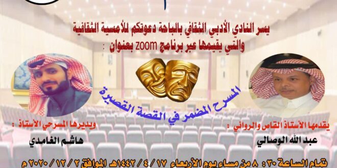 وأشار رئيس النادي الأدبي الثقافي بالمنطقة حسن بن محمد الزهراني أن هذه الأمسية الثقافية تقرأ المسرح في القصة القصيرة في نماذج قصصية سيتناولها ضيف الأمسية حيث تأتي في سياق الأنشطة المتنوعة التي يقوم بها النادي إرضاءً لجميع الأذواق والأطياف الثقافية وسيتم حفظها عبر موقع النادي على اليوتيوب بعد انتهاء الأمسية.