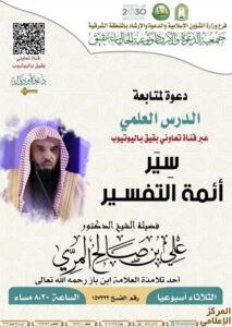 ينظم فرع وزارة الشؤون الإسلامية والدعوة والإرشاد في المنطقة الشرقية، بالتعاون مع جمعية الدعوة والإرشاد وتوعية الجاليات ببقيق، كل يوم ثلاثاء من كل أسبوع، درس علمي “عن بُعد”، بعنوان: (سير أئمة التفسير) عند الساعة الثامنة والنصف مساءً، وذلك عبر البث المباشر على حساب قناة الجمعية في اليوتيوب.