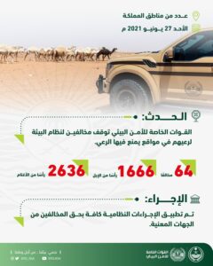 أوقفت القوات الخاصة للأمن البيئي (64) مخالفًا لنظام البيئة، منهم (13) مواطنًا و(51) مقيمًا، من الجنسيات السودانية والباكستانية والبنجلادشية والهندية واليمنية، ارتكبوا مخالفات رعي (1666) رأسًا من الإبل و(2636) رأسًا من الأغنام في أماكن يمنع فيها الرعي في عدد من مناطق المملكة.