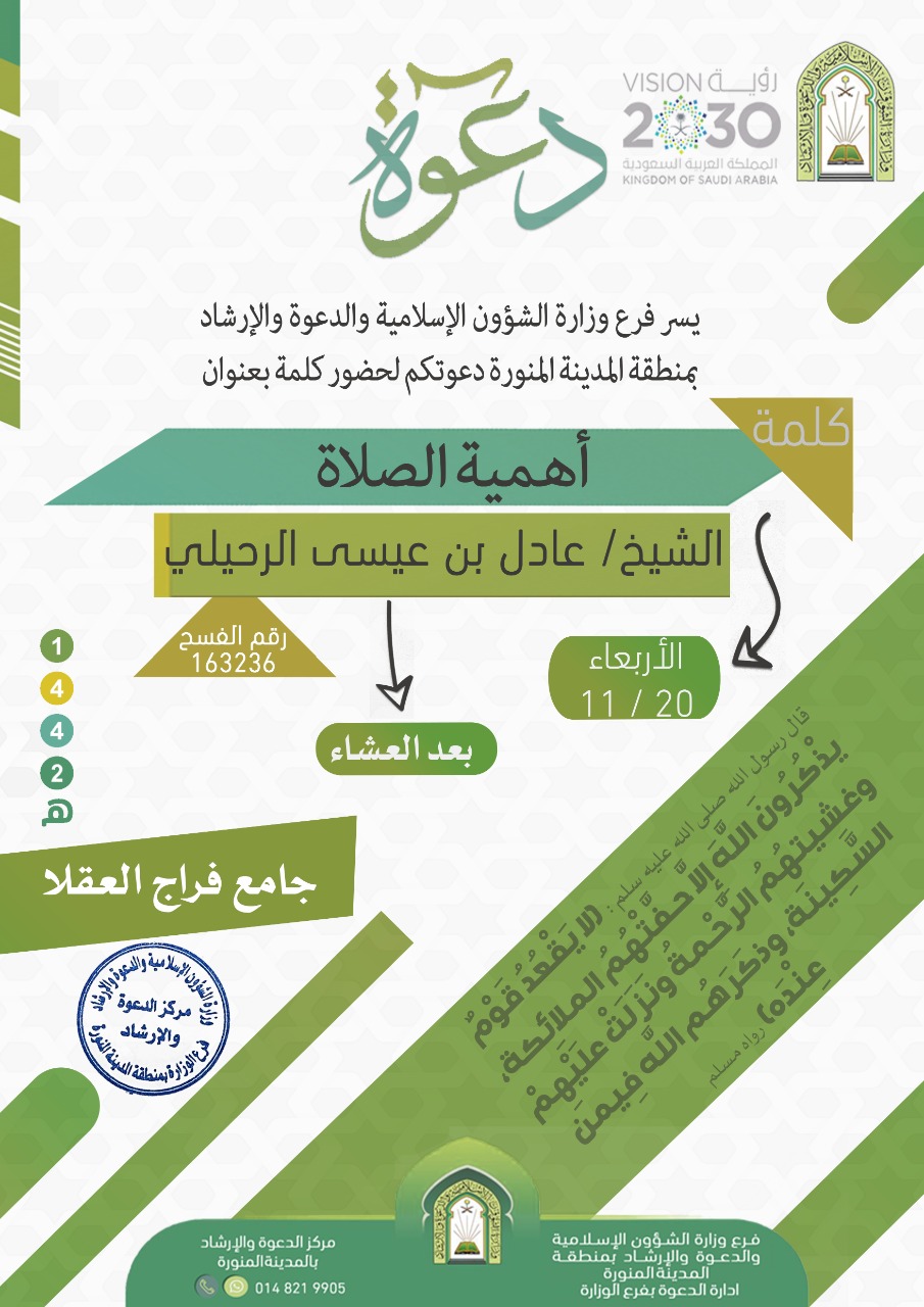 كما ينظم الفرع كلمة دعوية بعنوان: (وصايا نبوية اجتماعية) في جامع الرضوان يوم الاثنين من كل إسبوع بعد صلاة العشاء، وكلمة دعوية بعنوان: (أهمية الصلاة) في جامع فراج العقلا يوم الأربعاء القادم بعد صلاة العشاء.