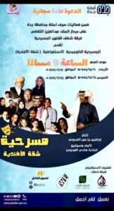 على شرف صاحب السمو الملكي الأمير عبدالله بن سعد بن عبدالعزيز آل سعود تفتتح مساء غدًا الأربعاء الموافق ١١/١٢/١٤٤٢ المسرحية الكوميدية “شقة الافندية” وذلك ضمن فعاليات صيف أمانة محافظة جدة والمقام في مركز الملك عبدالعزيز الثقافي بابرق الرغامة، بحضور عدد من الشخصيات الفنية والثقافية والإعلامية ، ومسؤولين من أمانة محافظة والفنانين والمهتمين بالفن المسرحي السعودي
