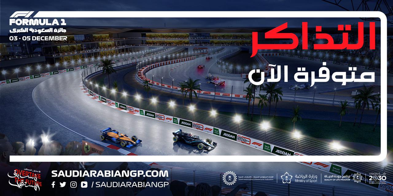 أعلنت وزارة الرياضة بالتنسيق مع الاتحاد السعودي للسيارات والدراجات النارية، اليوم الأحد 25 يوليو 2021م، طرح تذاكر حضور سباق “جائزة السعودية الكبرى للفورمولا1″، إحدى جولات سباقات الفورمولا1 لهذا العام 2021م، والذي سيقام في المملكة العربية السعودية لأول مرة، خلال الفترة من 3-5 ديسمبر المقبل، على كورنيش مدينة جدة.